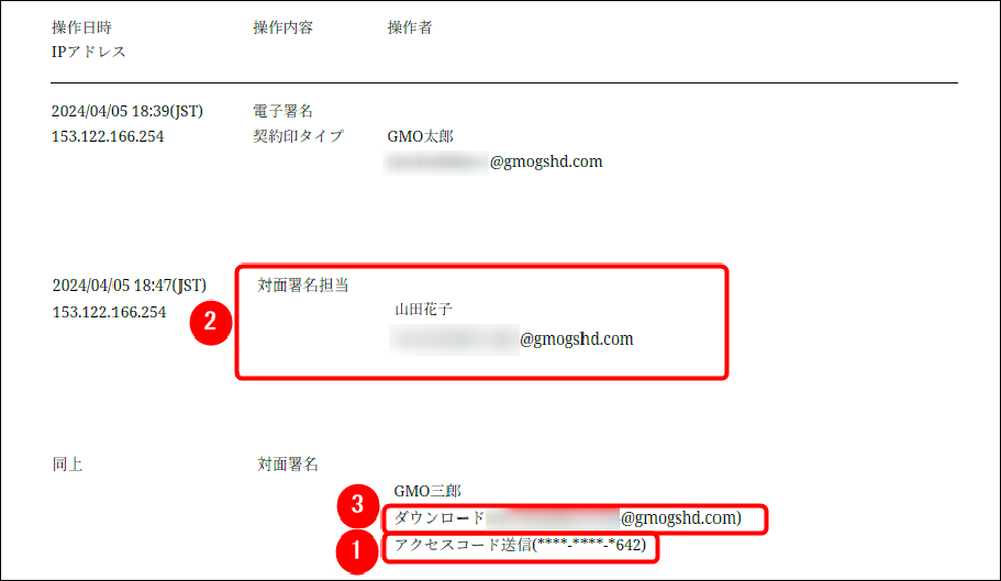 ダウンロードした電子契約締結証明書には対面署名担当者情報、署名済み文書提供先情報、アクセスコードSMS自動発行時の情報が記録されます。