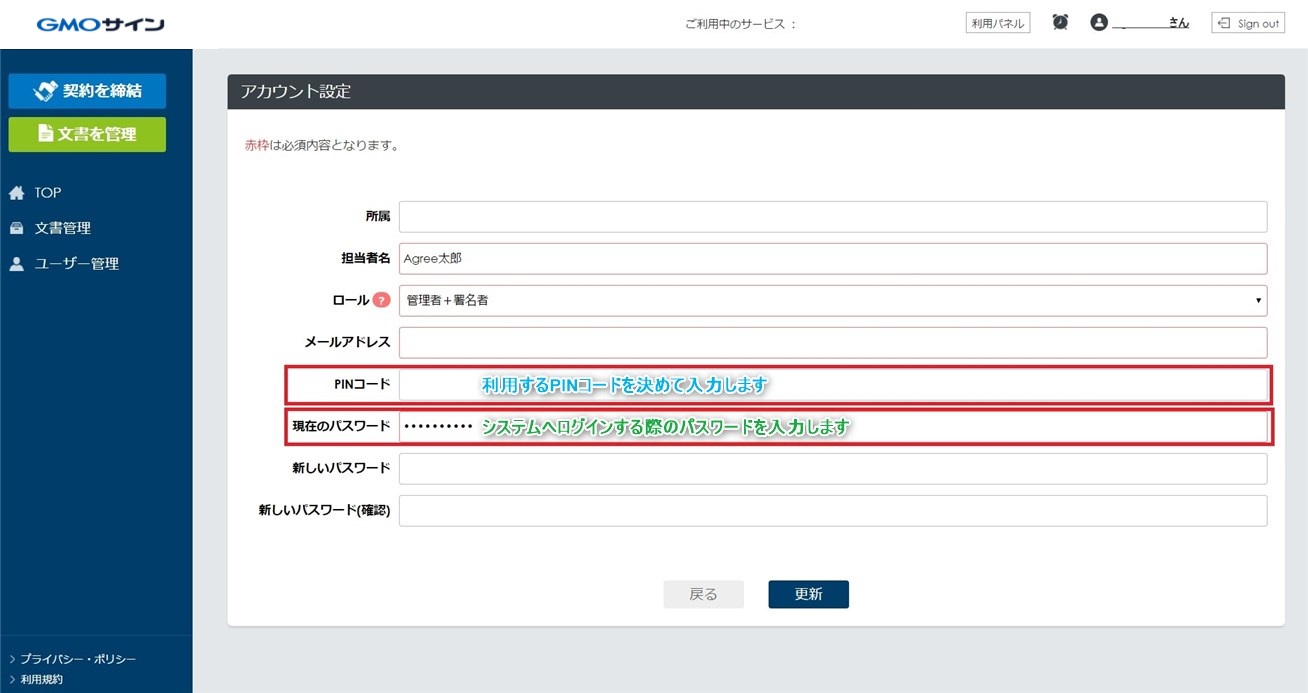 PINコードを忘れた場合 PINコードを忘れてしまった場合の再設定方法をご説明します。 ※署名者ロール(役割・権限)のユーザーのみ操作可能です。 ■操作手順 1. TOP画面内、右上にあるユーザー名をクリック 2. ユーザー情報の「編集」をクリック 3. PINコードと現在のパスワードを入力 PINコードは英数字ミックスで8桁以上の入力が必須です ※画像をクリックで拡大 4. 画面下部「更新」をクリックすると確認画面が表示。問題なければ「更新」をクリック。 5. 設定完了です 前の画面にもどる 関連記事 【ユーザー関連】PINコード設定[Ver.1] 各種エラー画面一覧 アクセスコードがわからない ご契約者様向け 使い方ガイド・お役立ち資料 【実印タイプ】署名操作手順