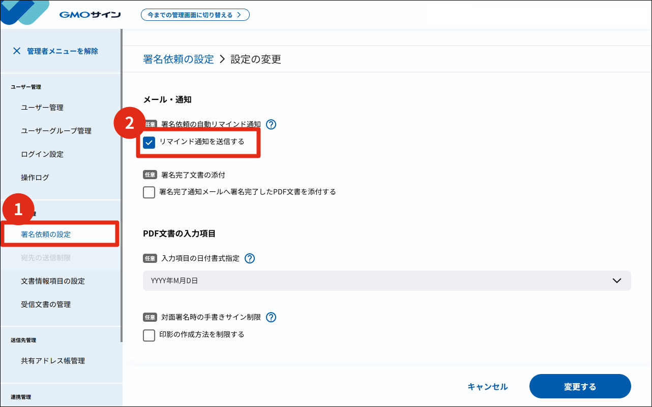 GMOサインの管理者メニューから署名依頼の設定>設定の変更>署名依頼の自動リマインド通知をを送信するにチェックを入れることで、未署名の方に対して自動リマインドメールが送付されるようになります。